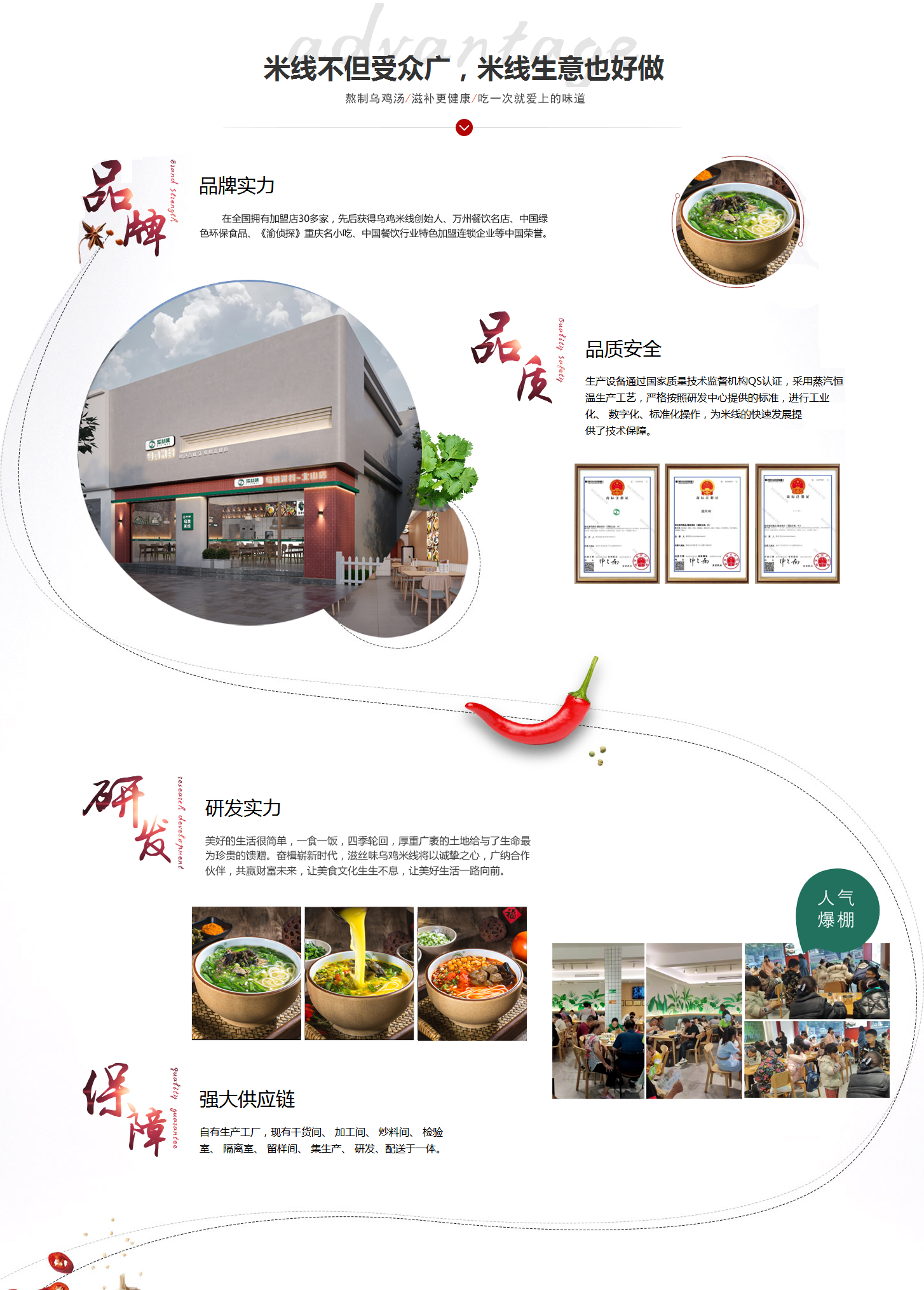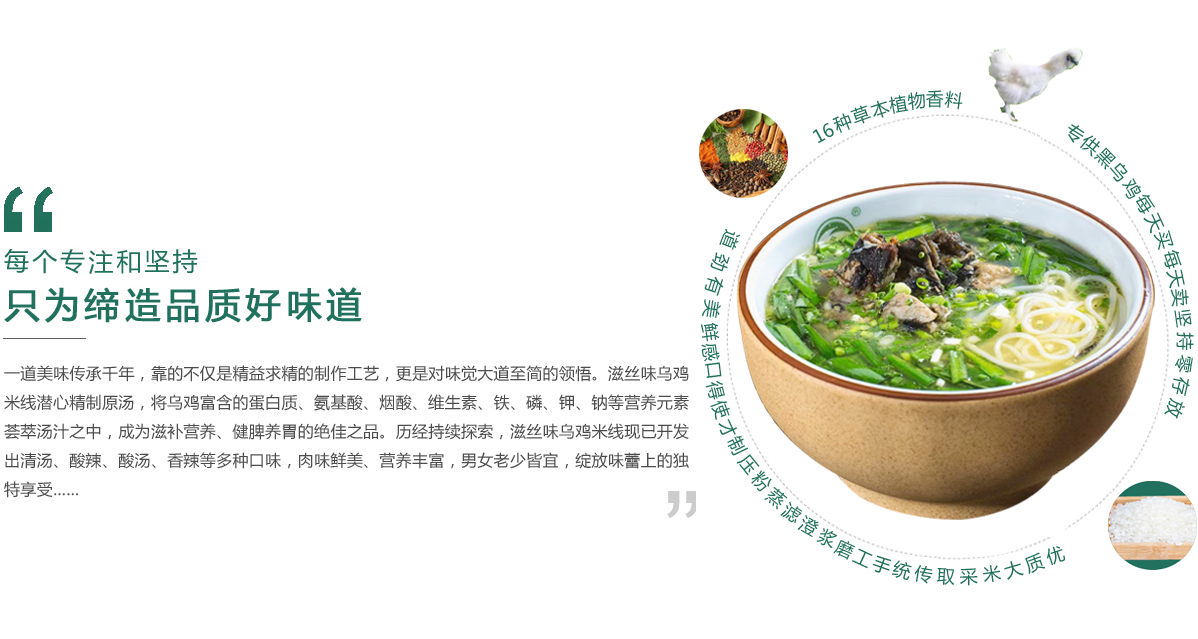 “滋丝味乌鸡米线”是一个源于对美食热爱和养生追求的餐饮品牌。创始人卿先生,对美食有着浓厚兴趣,喜欢研究各种不同的食材和口味,对于养生更是有着独特的见解。在从事了20余年建筑行业后,发现对餐饮的热爱更胜一筹,于是全身心地投入到餐饮行业中。