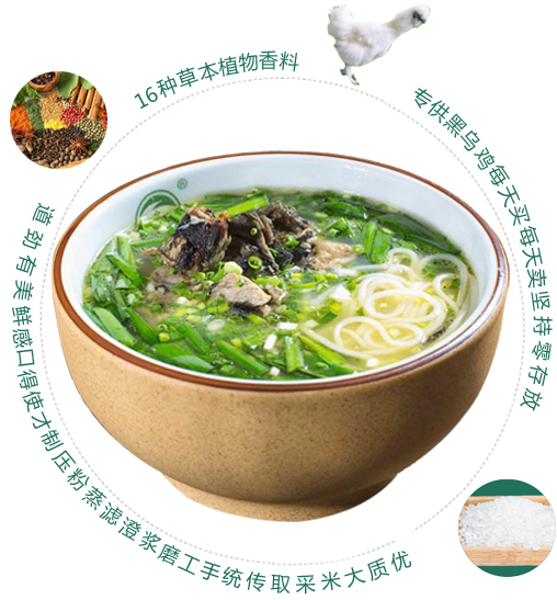 一道美味传承千年,靠的不仅是精益求精的制作工艺,更是对味觉大道至简的领悟,滋丝味乌鸡米线潜心精制原汤,将乌鸡富含蛋白质、氨基酸、烟酸、维生素、铁、磷、钾、钠等营养元素荟汤汁之中,成为滋补营养、健脾养胃的绝佳之品。历经持续探索,滋丝味乌鸡米线现已情节发出清汤、酸辣、香辣等多种口味,肉味鲜美、营养丰富。男女老少皆宜,绽放味蕾上的独特享受.....